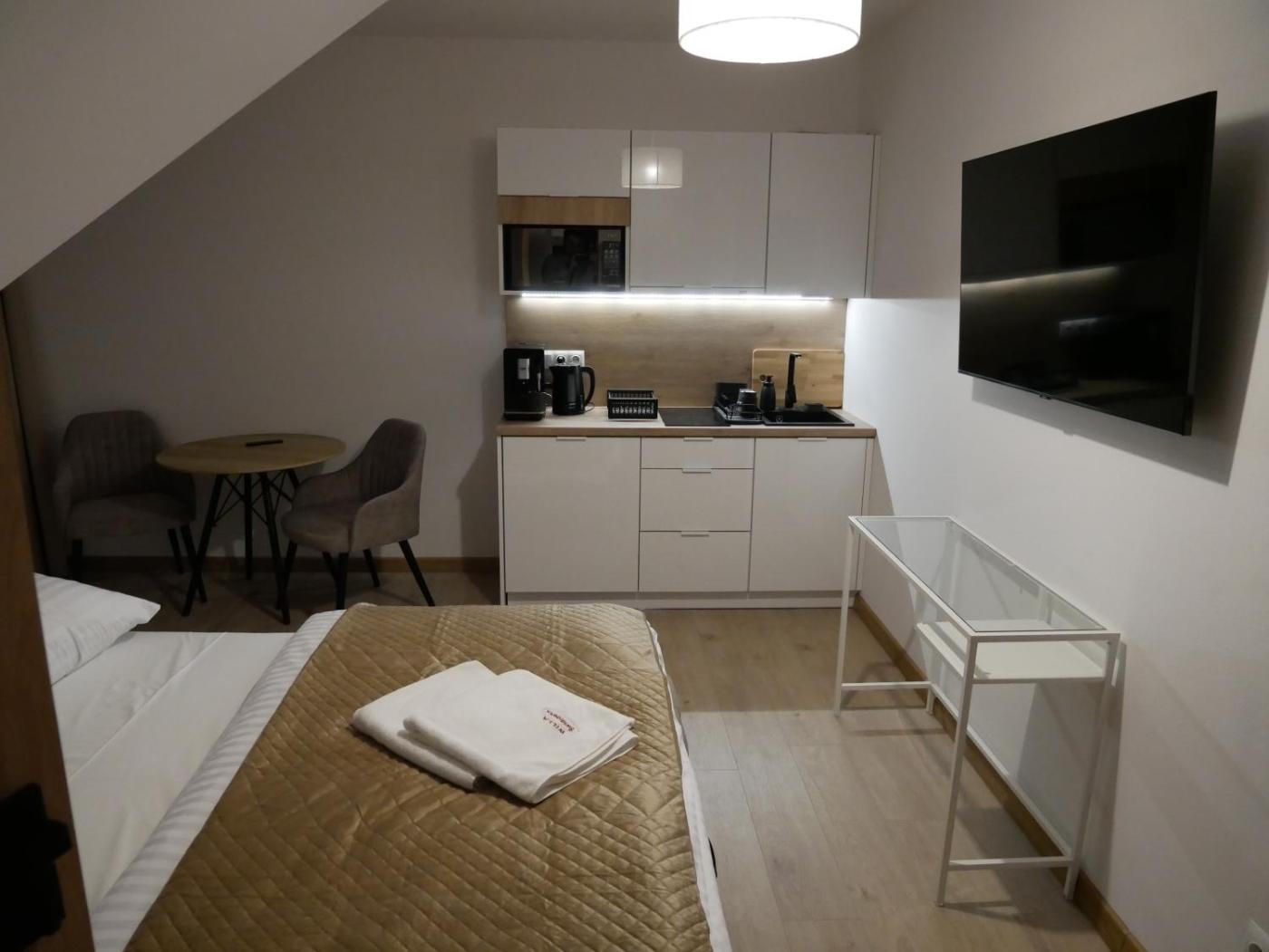 Apartament. This apartment comes with 1 bedroom, a kitchenette and 1 bathroom with a shower and a hairdryer. Guests can make meals in the kitchenette that features a stovetop, a refrigerator, kitchenware and a microwave. The apartment features a coffee machine, a wardrobe, parquet floors, a flat-screen TV with streaming services, as well as garden views. The unit has 1 bed. Apartament - 2 osobowy. Powierzchnia pokoju ok.: 23 mkw. ;